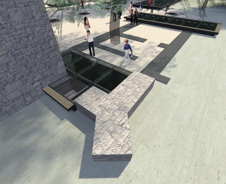 În partea vestică, încadrată de rampa şi treptele de acces în piaţă este amplasat punctul de informare - grup sanitar care va asigura serviciile de ghidare a vizitatorilor zonei istorice în general şi a Turnului Ştefan şi a vestigiilor prezentate în special