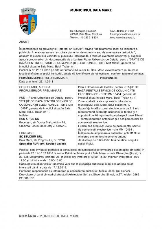 Consultare asupra propunerilor preliminare PUD - pentru ''STAȚIE DE BAZĂ PENTRU SERVICII DE COMUNICAȚII ELECTRONICE - SITE MM 10464'' generat de imobilul situat în Baia Mare, Bdul. Traian nr. 1. Iniţiator: RCS & RDS SA.