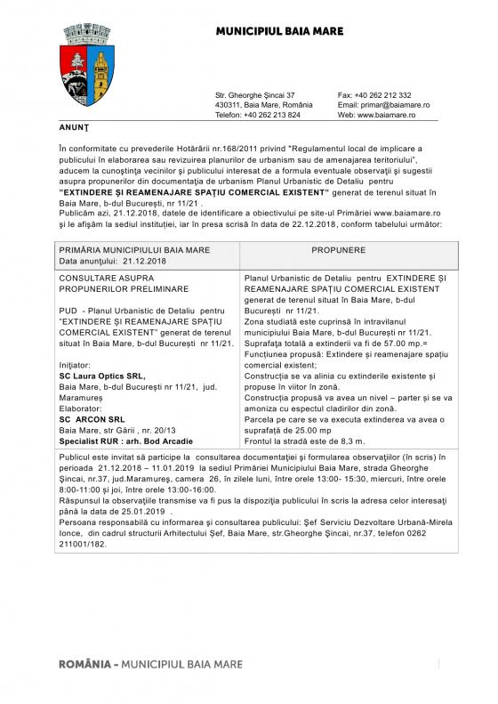 Consultare asupra propunerilor preliminare pentru Planul Urbanistic de Detaliu ''EXTINDERE ȘI REAMENAJARE SPAȚIU COMERCIAL EXISTENT'' generat de terenul situat în Baia Mare, b-dul București, nr 11/21