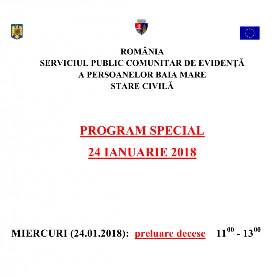 Program special de relaţii cu publicul în data de 24.01.2018 la SERVICIUL PUBLIC COMUNITAR DE EVIDENŢĂ A PERSOANELOR BAIA MARE STARE CIVILĂ