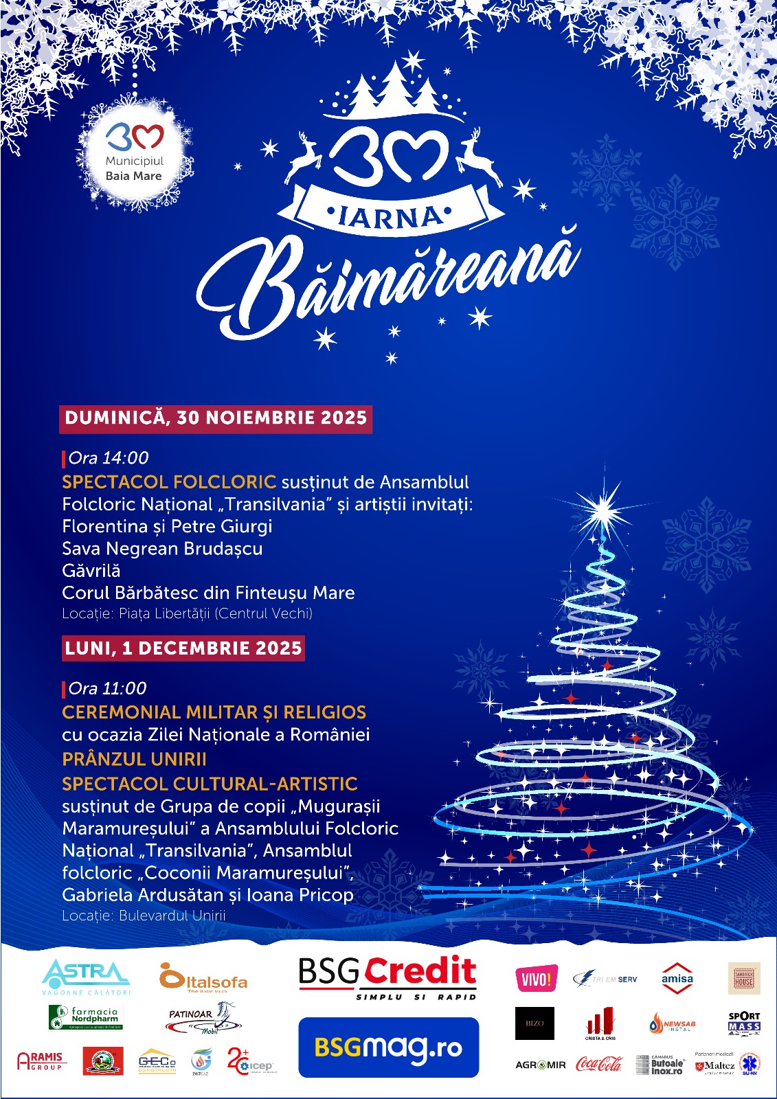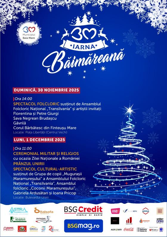 ”Ne reîntâlnim în inima orașului nostru pentru a da startul celui mai așteptat eveniment al celei mai frumoase perioade din an. O sărbătoare de suflet a comunității noastre, o lună întreagă de datini și tradiții, cu manifestări culturale și artistice pentru toate vârstele. Vă invit mâine, în Piața Libertății, să aprindem împreună iluminatul ornamental, să deschidem Târgul de Crăciun și să ne bucurăm de primul spectacol al iernii, susținut de Teatrul Municipal! Continuăm duminică, de la ora 14:00, tot la scena din Centrul Vechi, cu un spectacol susținut de Ansamblul Folcloric Național „Transilvania”, alături de artiștii invitați: Florentina și Petre Giurgi, Sava Negrean Brudașcu, Găvrilă și Corul Bărbătesc din Finteușu Mare. Luni, 1 decembrie, celebrăm împreună mândria de a fi români și dragostea față de țară. De Ziua Națională a României, ne vedem de la ora 11:00 pe bulevardul Unirii pentru ceremonialul militar și religios, ne așezăm apoi la aceeași masă pentru Prânzul Unirii, iar spre seară continuăm festivitățile cu un concert extraordinar susținut de Mugurașii Maramureșului, Ansamblul Folcloric Național „Transilvania”, Ansamblul „Coconii Maramureșului”, Gabriela Ardușan și Ioana Pricop. Să demonstrăm încă o dată că noi, băimărenii, atunci când ne rugăm, ne rugăm; când muncim, muncim; iar când ne distrăm, ne distrăm!”, transmite Ioan Doru Dăncuș, primarul municipiului Baia Mare.