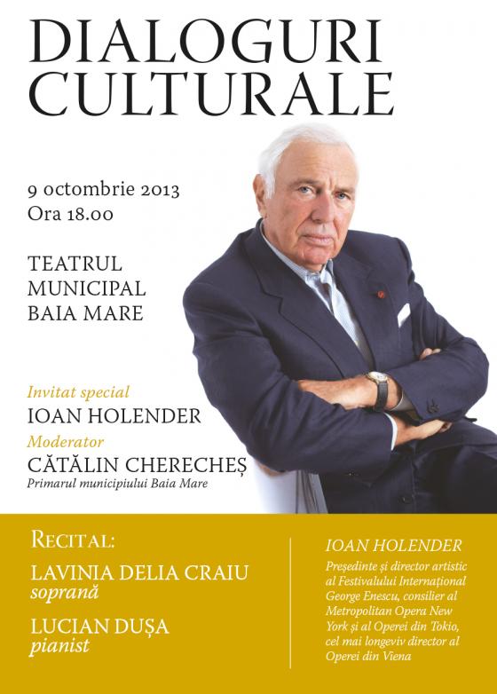 Dragi băimăreni, vă invit în data de 9 octombrie 2013, de la ora 18.00, la Teatrul Municipal Baia Mare, la o întâlnire culegendarul Ioan Holender. Acest prim eveniment organizat sub egida „Dialoguri culturale” vine în sprijinul şi dezvoltarea mediului cultural românesc. Invitatul de onoare al acestui prim „Dialog cultural” este IOAN HOLENDER – inginer, cântăreţ, regizor, tenisman, şarmant om de cultură şi de lume, impresar de vocaţie. Născut la Timişoara, Ioan Holender a fost cel mai longeviv director al Operei din Viena, conducând instituţia între anii 1992 şi 2010. În prezent este consilier al Metropolitan Opera New York şi al Operei din Tokio, de asemenea preşedinte şi director artistic al Festivalului Internaţional „George Enescu". De-a lungul timpului a fost onorat cu numeroase distincţii, printre care: Officier de L'Ordre des Arts et des Lettres, Franţa (1999), Österreichisches Ehrenkreuzes für Wissenschaft und Kunst 1. Klasse şi este membru de onoare al Academiei Române. În esenţă, ceea ce face Ioan Holender urmează întocmai sfatul pe care îl dă şi altora: “Oricine trebuie să-şi organizeze viaţa în aşa fel încât să facă ce ştie mai bine, căci nimic nu ne aduce mai multă mulţumire decât propriul succes.(...)Noi suntem cei care răspundem față de noi înșine și nici un dictator nu poate fi vinovat de soarta noastră proprie. Eu am devenit un exemplu pentru acest lucru, nefiind un om excepțional. Nimeni nu își părăsește propria țară de voie, ci de nevoie. Eu mă consider în debit față de această țară”- Ioan Holender. În cadrul evenimentului veţi putea adresa întrebări oaspetelui nostru de seamă. Vă aştept cu mare drag, intrarea la eveniment este liberă.