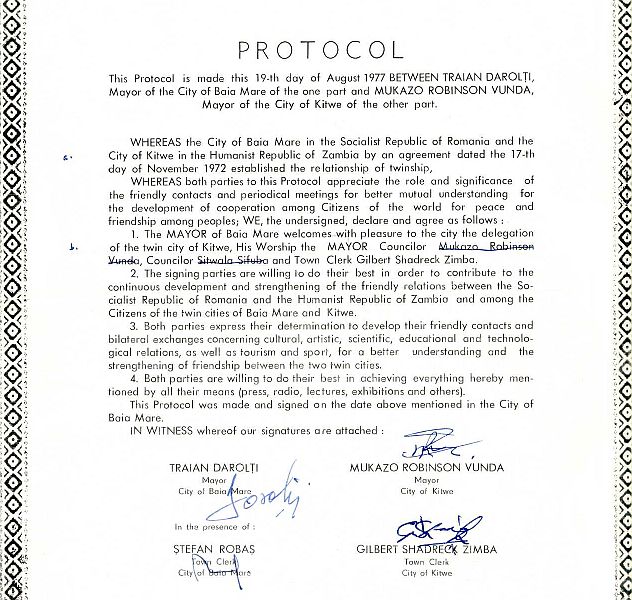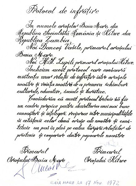 Orașul Baia Mare este înfrățit cu Kitwe din anul 1972.